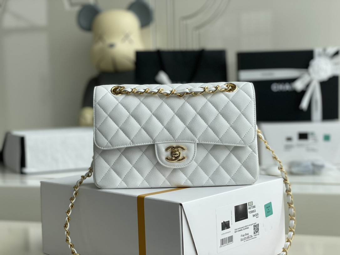 Classic Flap Small ℂ-𝟝𝟡𝟙 纯白色 原厂Haas细球鱼子酱 24K真金厚镀